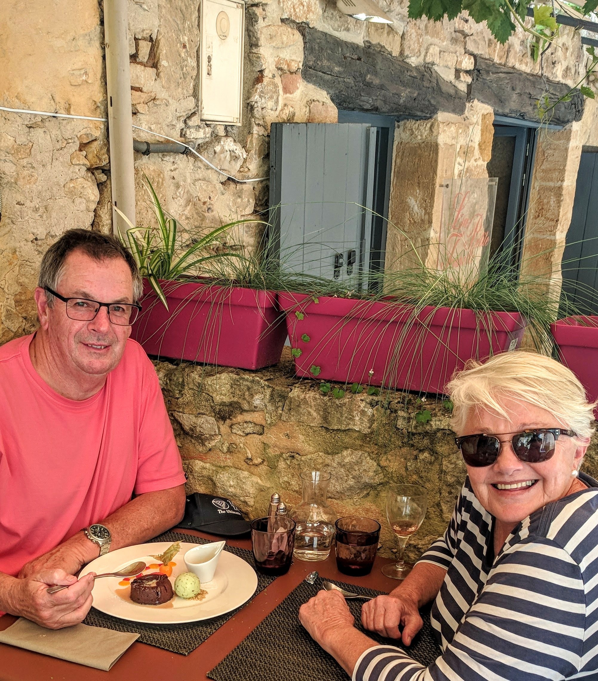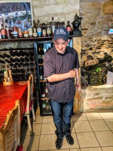 Our waiter at La Petite Tonnelle in Beynac et Cazenac, where we had lunch yesterday. We enjoyed this restaurant a few years ago, and it has not changed. Our waiter recognized Mals hat from the Targa Tasmania as he is a car enthusiast, so Mal gave it too him. He was so happy.