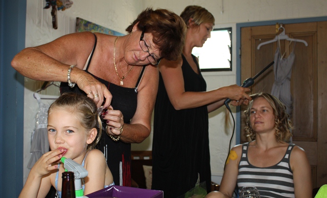 Merelyn and Lee doing a great job with the hair dos.A kiss for Rosie from Creed before the wedding preparations.The bride arriving by boat...left click on photo to enlarge