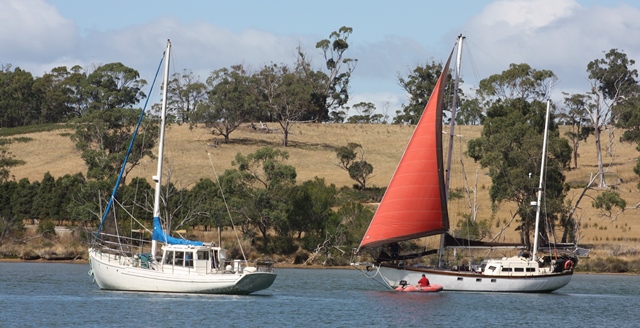 A larger boat came to the rescue, to tow the marooned boat off the sand and oyster shells.These swans visited us regularly on Bruny…obviously very tame as they ate from our hands.Bruny IslandA very soft sunset one evening from the boatWatching Wild Oats win the Sydney to Hobart race again this year… I don’t know who enjoyed it the most, Molly, Mal or Michael !!!!A bit hazy…. Wild Oats with media helicopter coming up the Derwent River near home… left click on photo for a clearer imageMolly is a very gentle and NOW happy dog after being rescued from a shocking cruel life in Grafton NSW (she had been tied up permanently, beaten and not fed very often. She suffered with very bad malnutrition.)Hobart from the top of Mount WellingtonBoating under the Tasman Bridge HobartA peaceful night on the boat