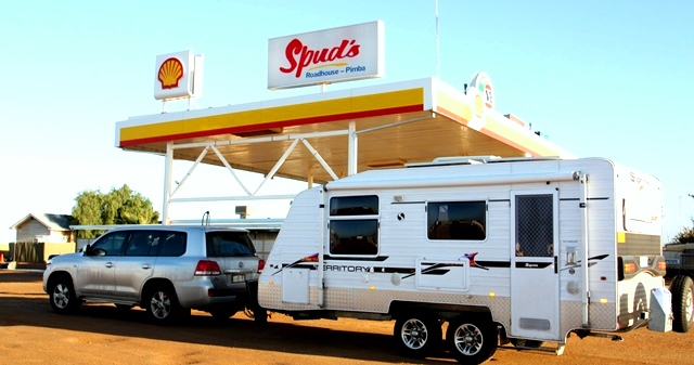 Fishing boat at Exmouth… we bought some yummy fresh prawns here for dinnerA typical Port Hedland car…. most people here are involved in the mining industry. Our car and caravan looks a bit like this at the moment. At least you would not get booked going through a speed camera. Can’t read the number plate.A monument at Port HedlandDampier Salt …. Port Hedland operationsWe caught up with Chris for a couple of days in Port Hedland (my ex for those that don’t know him)