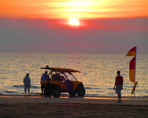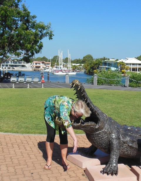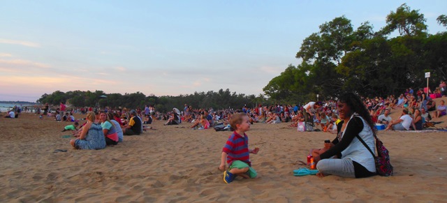 Dinner with Scott (Terlich) and Gail (Mitchell) who have made Darwin their home now for a whileKath and Pete joined us too. Pete works for the Crocodile Gold Mining Company and Kath flew up from Ballina to catch up with us here. A long way to come but certainly appreciated by us.Music at Mindil Marketsa stunning Darwin sunsetSome of the crowd at the Mindil Night Markets. Great food from so many cultures which we took down to the beach to eat. I loved this photo of the small boy talking to the young girl. Two cultures getting along.It wasn’t hard to get a good photoWe caught up with Wendy and Pete, friends from Canberra, while in DarwinAnother Darwin croc with me as bait !It was so good catching up with Scott and Gail. Scott (Terlich) used to be my brother-in-law. As he is only 7 years older than my son Michael, he was like another son. He spent a great deal of time with me while he was growing up. He didn’t drink bourbon in those days !!! Scott had a jumper on and decided to use our heater…. he has certainly acclimatized.