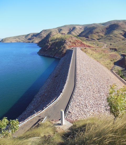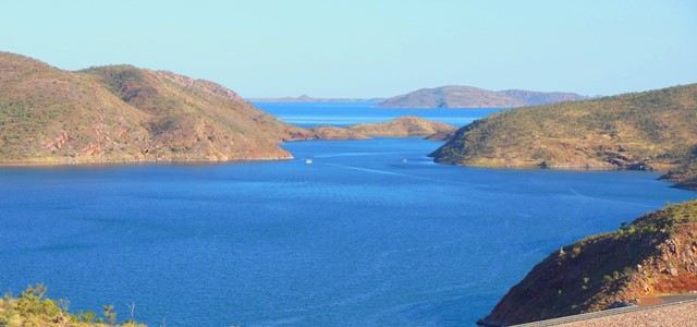 Lake Argyle dam on the Ord RiverIt is stunningMal enjoying the infinity pool at Lake Argyle Caravan ParkI got to drive the boat on the cruise !!!A sea plane landing next to us out on the lakeA croc on the bankThis Jabaru was soooo sad. They mate for life and he returns each year waiting for his mate to arrive but she never comes. He apparently sits there year after year looking out over the lake waiting.A rock wallaby and baby on one of the islandsVictoria River on the way to Lake Argyle