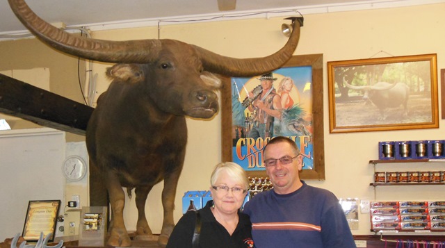 The hot springs at Mataranka were wonderful. We enjoyed swimming in them so much we stayed an extra day.Mal in the 34 degree hot springs. The water was so clear and the bottom looked so close but I could not reach it !!!! Very deep.a localNear the creek at MatarankaA statue in the town gardens…Mataranka township is predominately an aboriginal community. We were lulled to sleep each night by a huge group of very intoxicated aboriginals. A bit of a problem unfortunately.The buffalo inside the Adelaide River Pub…famous in Crocodile DundeeMal feeding the peacock at our campsite at Mount Bundy Station Adelaide RiverHe was very handsome and cheekyKids riding at Mount Bundy Station…. the dust is thick out hereFeeding “Norman” the duck at MatarankaYES… this sign was right near our caravan campsite on the banks of the Adelaide River